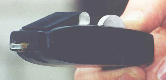 There was a small raised round aluminum button/rod on the bottom of the phaser one on