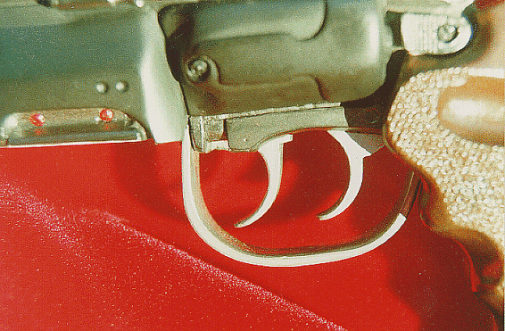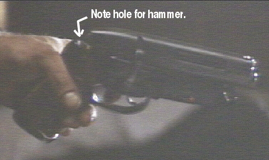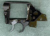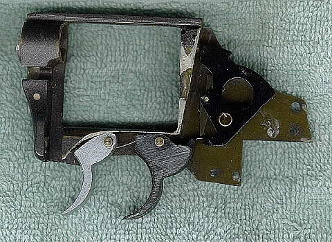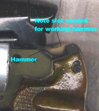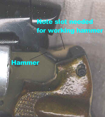 to cut down the Bulldog’s hammer to spare the Using a cut away pistol frame, I studied the working of the trigger and hammer actions carefully to recreate them in the model. I found that the Bulldog hammer has a small spring loaded lever that the trigger pushes on to the throw the hammer back, and that for the trigger to return to the fire-ready position, it had to stroke by this lever to get below it again. This lever had to be able to allow the trigger to pass, and then it had to spring back in place so that the trigger could engage it again. Prototype testing demonstrated that the cast polyurethane was not strong enough to withstand this pressure when cast to the same dimensions as the steel part, so I was forced to both thicken this lever as much as possible and to recast it out of epoxy.