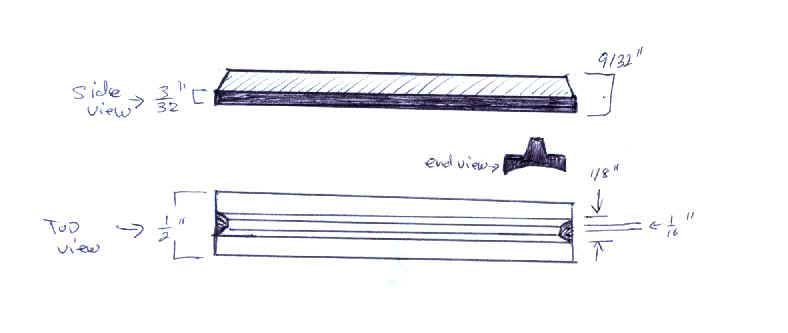 Making the handle gripsNow let's concentrate on making the handle grips. If you decided to take the easy way out and buy handle rubber grips from someone that makes them, you can skip this section. The handle grips, if you are looking at them from the end, look like an upside-down T. The grips measure 3" long by 1/2" wide by 9/32" tall.
