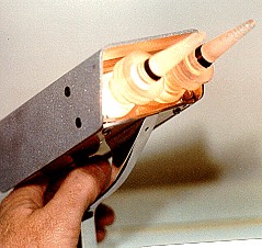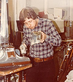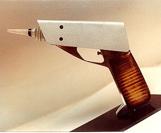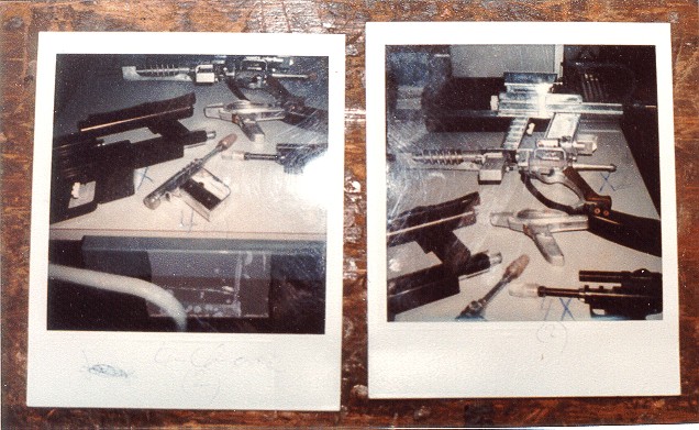 Next was a film called Get Crazy, for more please see the Get Crazy image gallery. And of course The Greatest American Hero which I cover in How I helped "The Greatest American Hero". A little side note, remember Mr. MOM? -- Hand Prop Room did a few props for that like the killer vacuum cleaner called "The Beast". I had nothing to do with it but here is a guy called Harvey working on "The Beast," putting a cover over the drive motor that was added to make it self-powered and to run around on its own by remote control. I did at last get them to let me build one little gun out of my junk boxes, and this is what came of it: In Hollywood as they say "We had creative differences." Once again, I moved on, after all of 9 months. I went independent