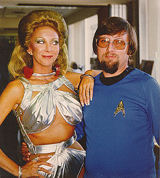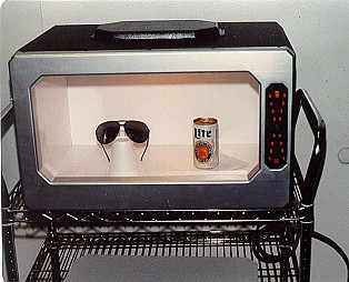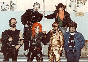 I then got a call from Mr. William Malone whom I had contacted earlier about his Forbidden Planet collection and he had helped me with a model of the C57D, the space ship from the film, along with the DR raygun pistol from the movie. He was doing a small film then called Titan Find, later to be renamed Creature (IMDB). He was looking for someone to recreate the computer panel used in the 1955 MGM film, The Invisible Boy. We took on the job by renting a friend's garage. (And made all 882 two-inch square lighted panels too!) Funny as this was a fairly low budget film I was offered a credit as part of the payment, which I had to take, and so my ONLY film credit was for the building of this computer panel, and it was NOT for props, after all, it was a part of the set so I got a film credit for set building...darn! For more images see the Creature gallery page. We also did a few props for a film called Radioactive Dreams (IMDB) and spent one night working as extras to see our props in the film and to have fun being in a film. And of all things I am wearing the gold lamé costume that Gil Gerard wore in Buck Rogers in the desert planet show, and it was tight! Jackie is the one in the red wig. Looking for a good product led