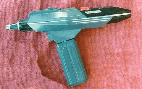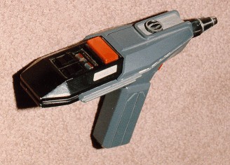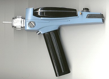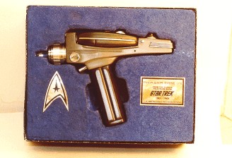 license. He said okay, so what do you have? So we did the horse and pony show, pulled display bases and put out a classic Phaser, a classic Communicator, a classic Tricorder, a classic Phaser one, then, on an another display base, an ST3 (Star Trek III) Phaser, an ST3 Communicator, and an ST3 Tricorder. Then, on a third dsiplay, we put out a Klingon Disruptor, Communicator and Tricorder also from Star Trek III.