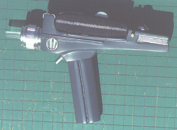 Right below the top cap and to the rear of the muzzle on the left side (just to be sure we all are talking about the “same left side”, left and right is determined by holding a weapon in your hand (either hand is OK), muzzle of the gun pointed away from you, then the side that is on your left is the left side and the side that is on your right is the right side) is a detail that looks like a knob in/on the left side of the main body. This has become known as the dilithium cap although there is no evidence that it was ever called that on the show.